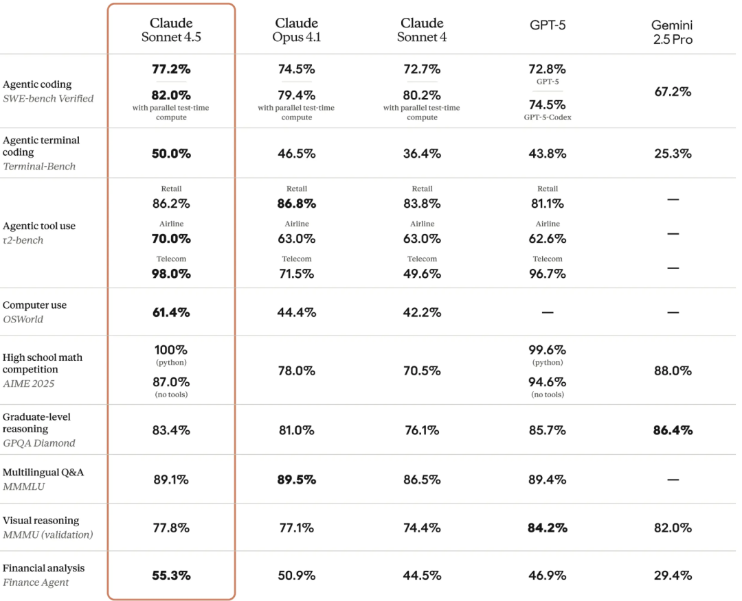 总之,Claude Sonnet 4.5在多项领域都实现了对自己的超越,成为该领域内的最佳模型。