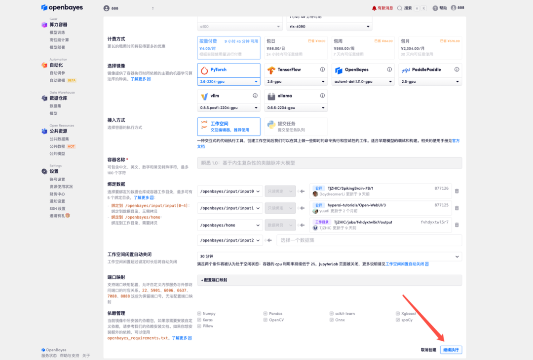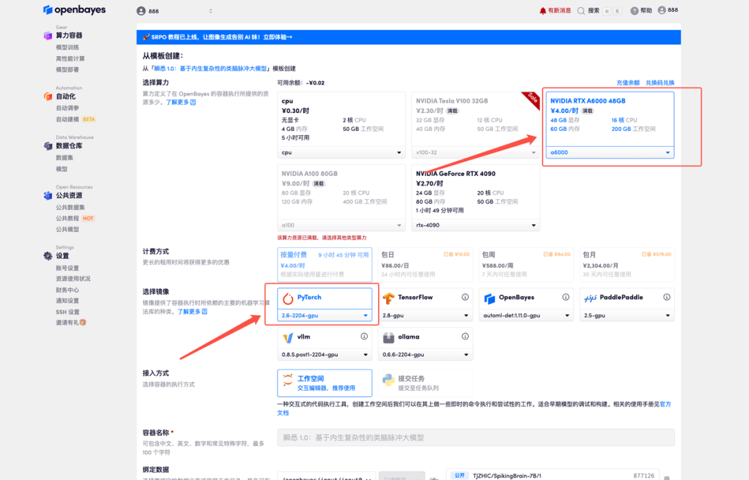 3. 选择「NVIDIA RTX A6000 48GB」以及「PyTorch」镜像,并点击「继续执行」。OpenBayes 平台提供了 4 种计费方式,大家可以按照需求选择「按量付费」或「包日/周/月」。新用户使用下方邀请链接注册,可获得 4 小时 RTX 4090 + 5 小时 CPU 的免费时长!