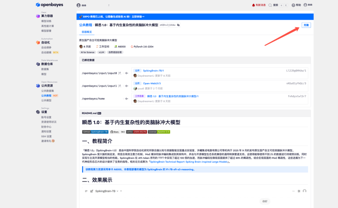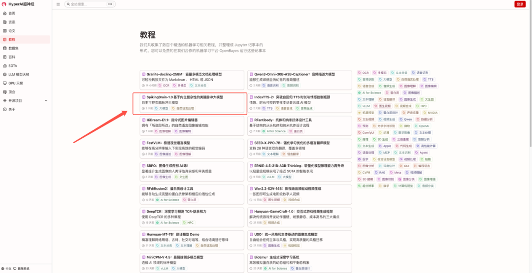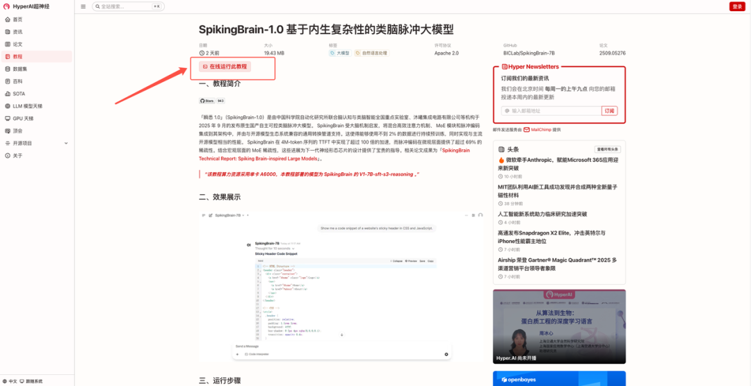 1. 进入 hyper.ai 首页后,选择「教程」页面,并选择「SpikingBrain-1.0 基于内生复杂性的类脑脉冲大模型」,点击「在线运行此教程」。