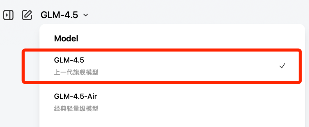 从下拉菜单可以看到,他们已经把GLM-4.5标成了“上一代旗舰模型”。
