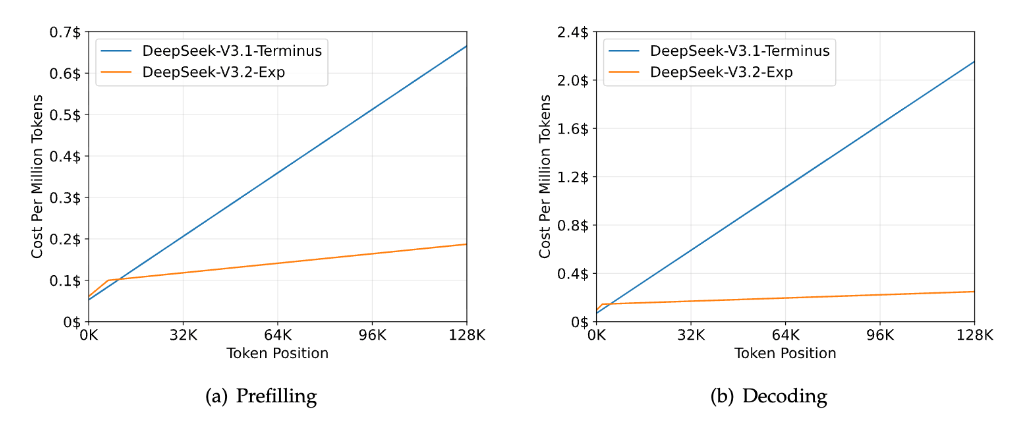 另外,论文提到,使用DSA的模型在处理128K长上下文时,推理成本显著低于DeepSeek-V3.1-Terminus,尤其在解码阶段。