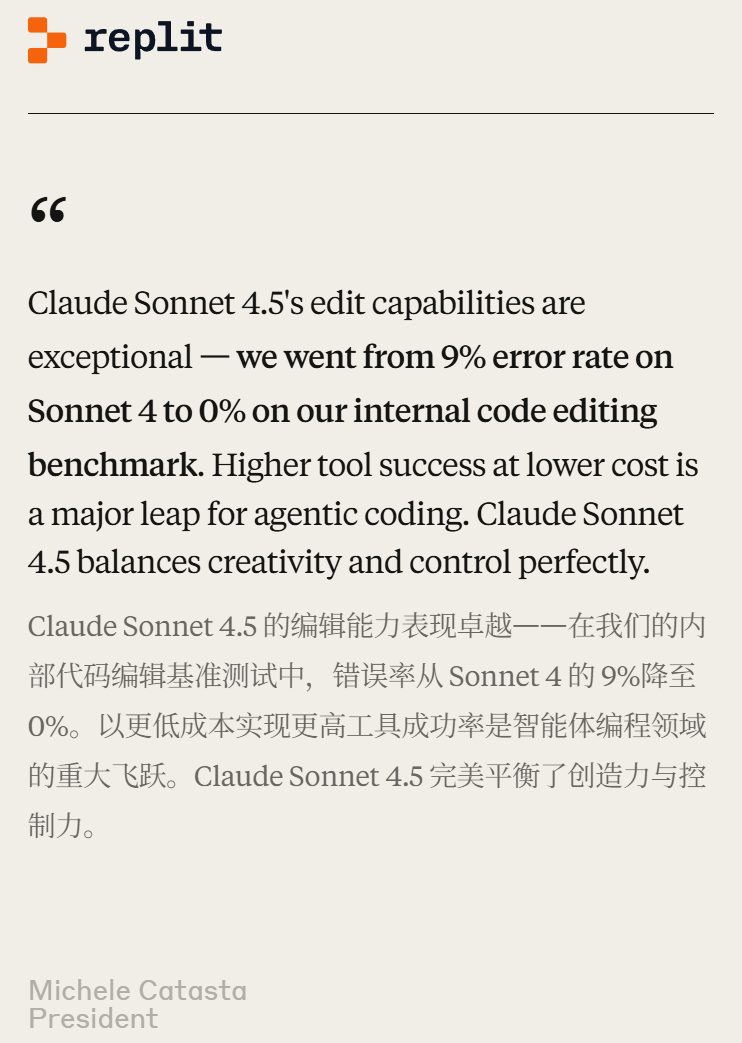 replit内部代码编辑测试中,错误率从Sonnet 4的9%直接降至0%。——Michele Catasta, replit President