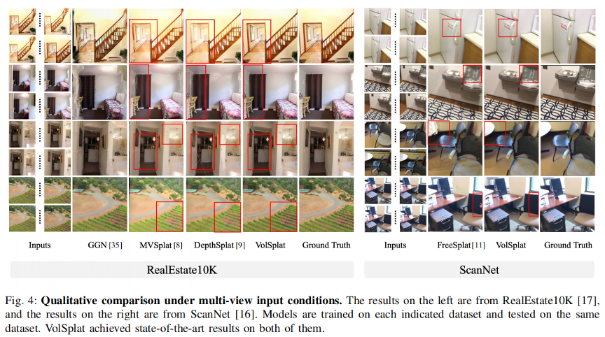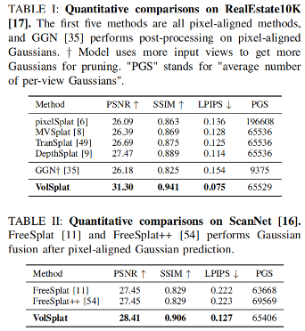 在公开数据集上的对比实验显示,VolSplat在RealEstate10K和ScanNet(室内)数据集上的视觉质量与几何一致性上均优于多种pixel-aligned baseline。这些数值既说明了视觉质量的提升,也反映了几何一致性的增强。