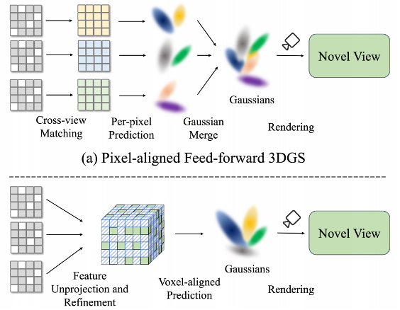 然而,现有的前馈3DGS方法主要采用“像素对齐”(pixel-aligned)策略——即将每个2D像素单独映射到一个或多个3D高斯上。