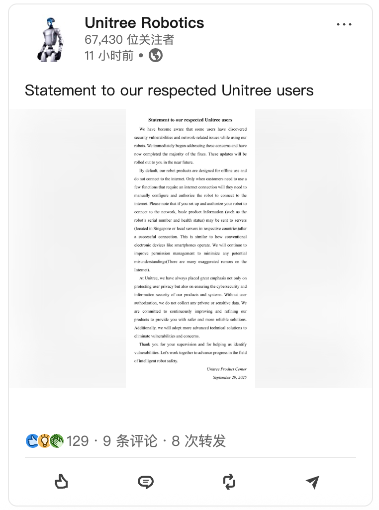 “我们已经了解到,一些用户在使用我们的机器人产品时发现了系统安全漏洞和网络相关问题。我们立即着手解决这些问题,并且目前已经完成了大部分的修复工作。这些更新将在不久的将来陆续推送给您”