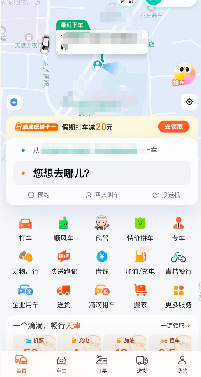 成功开通AI叫车后,我们可以看到App首页最左侧中间位置出现了“AI叫车”,点击就能进入小滴页面。