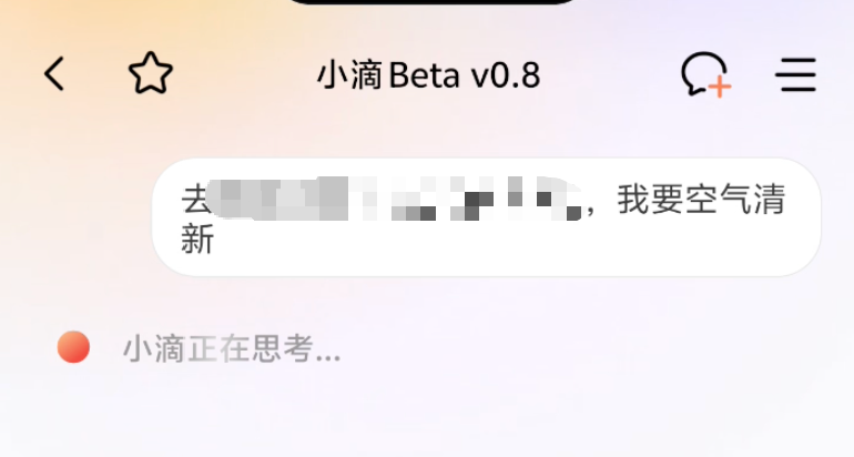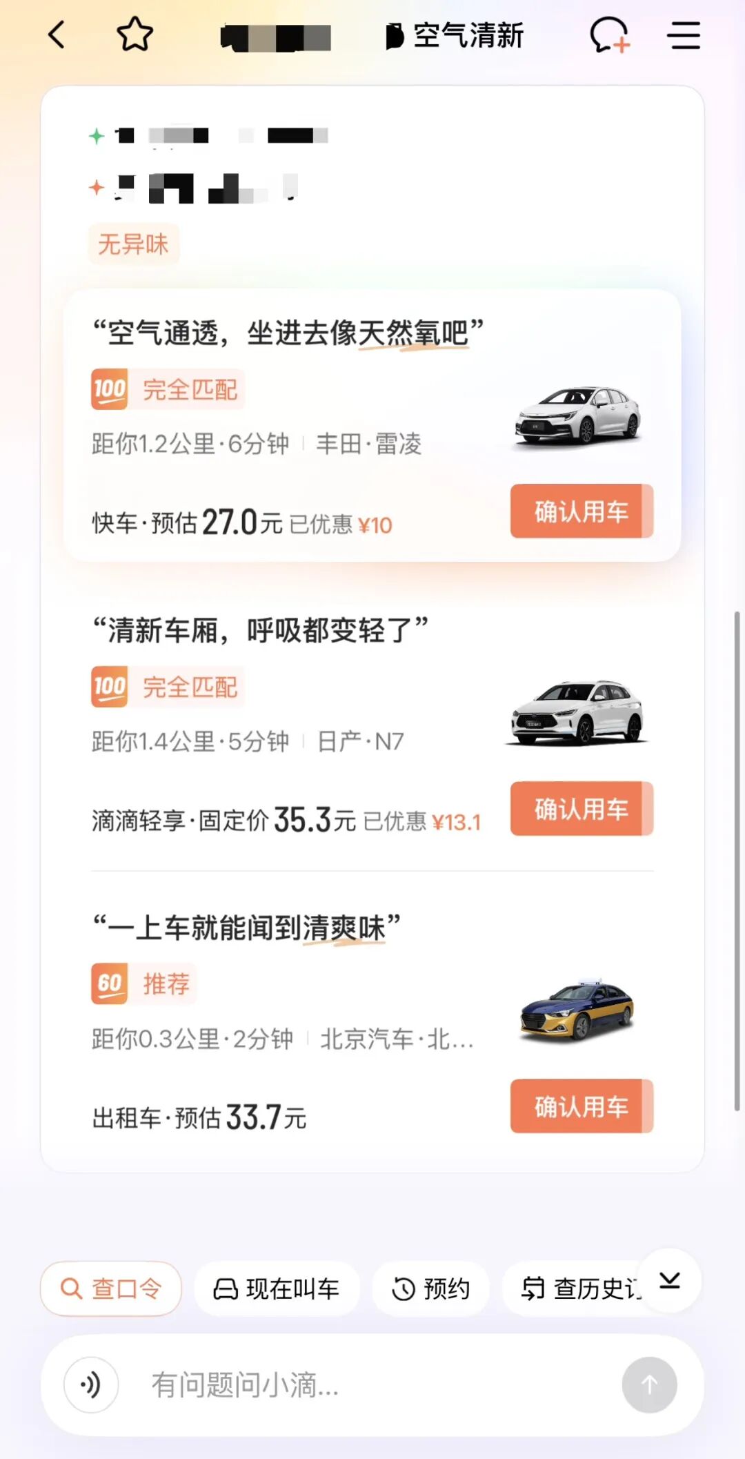 我更关注车内空气好不好,所以点击空气清新。小滴接到我的打车需求后就开始思考。