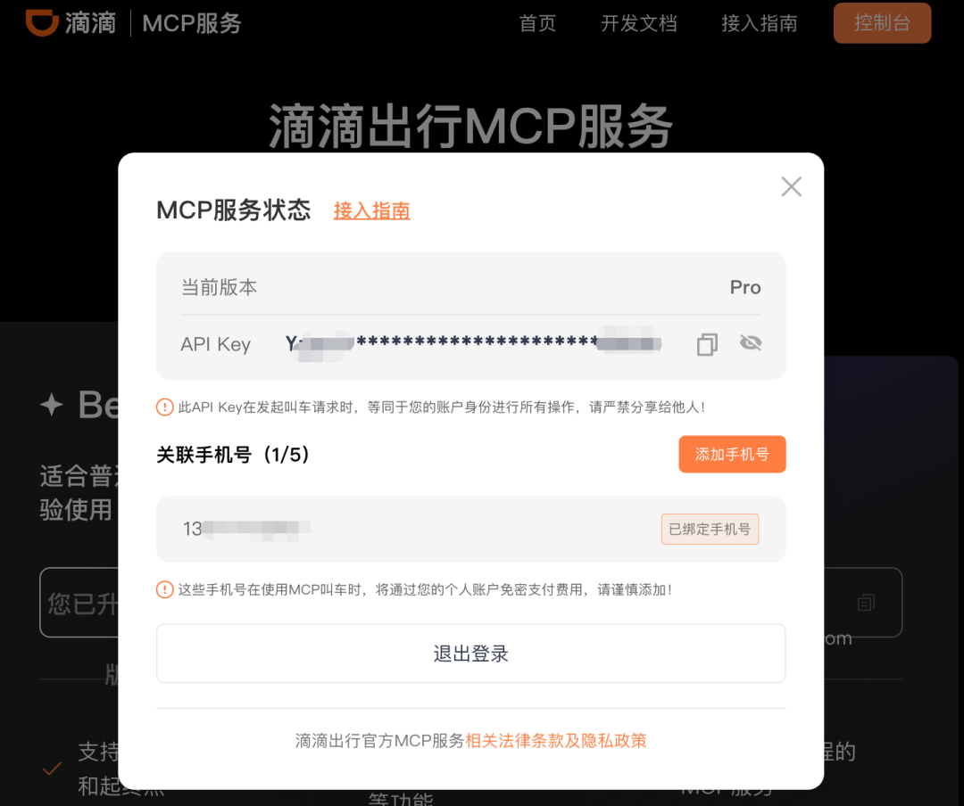 在滴滴出行MCP服务官网,就能直接获取到MCP服务的API Key,下方关联的手机号就是我的滴滴账户。
