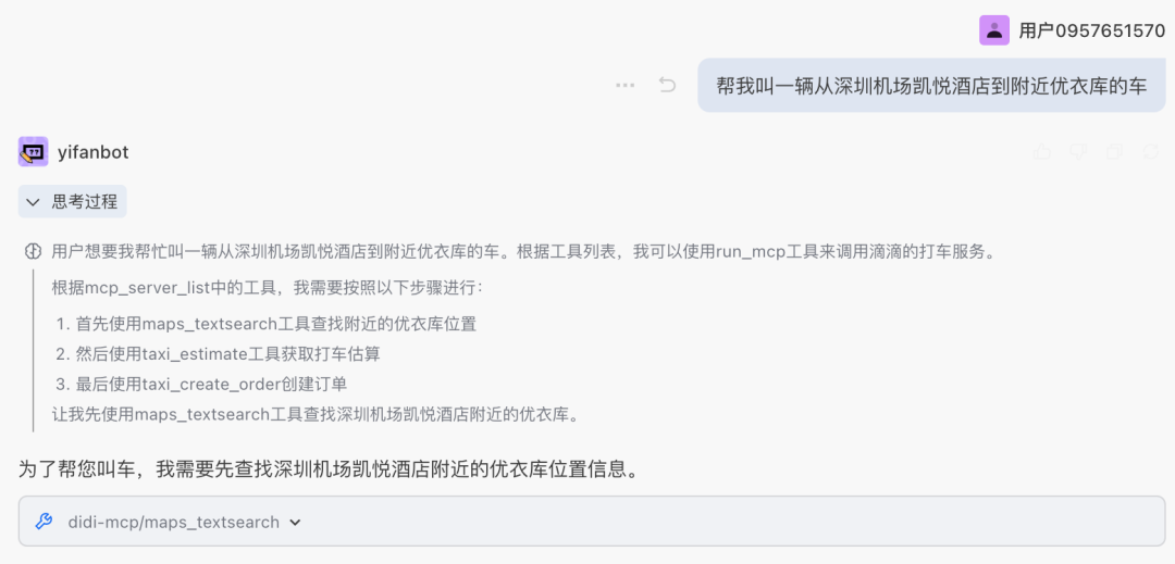 比如我想去附近买个衣服,人生地不熟的显然要求助智能体,让它帮我叫一辆从酒店到附近服装店的车。智能体此时就展开思考,先找到服装店的位置,再计算打车费,然后创建订单。