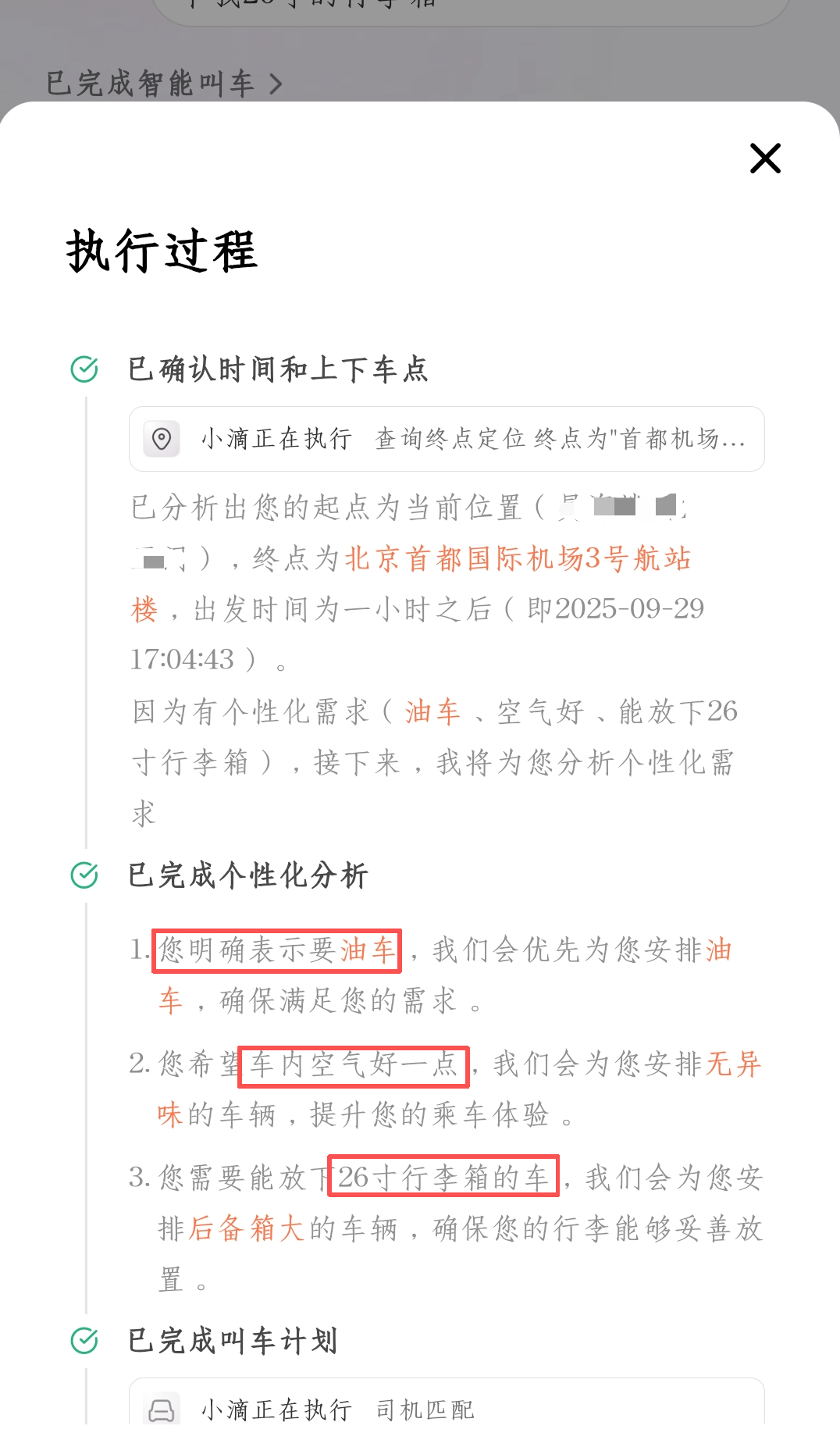 这一次叫完车后我还发现,点击上方的“已完成智能叫车”,就能看到小滴清晰的思维链,可以看到它对我的多条个性化需求都进行了逐个分析。