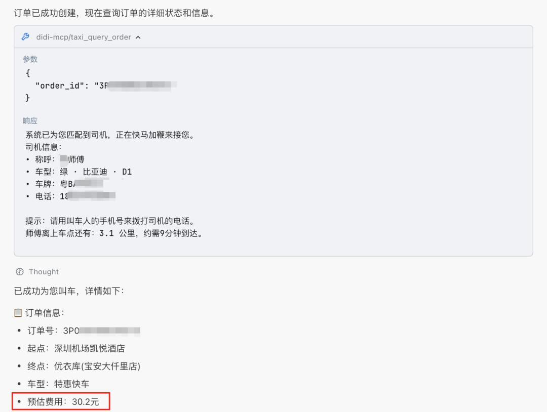 前面提到,API Key还关联着我的滴滴账号,由于我提前在滴滴开通了免密支付,所以智能体在帮我叫到车生成订单的一瞬间,就扣除了预估费用。
