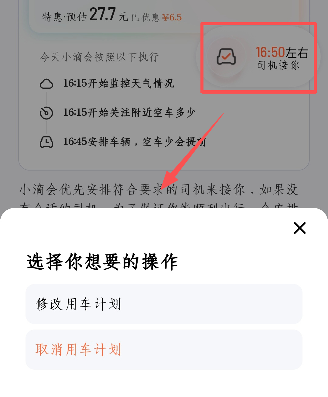 如果用车计划有变的话,点击右侧椭圆型的浮岛,就能取消或者修改用车计划: