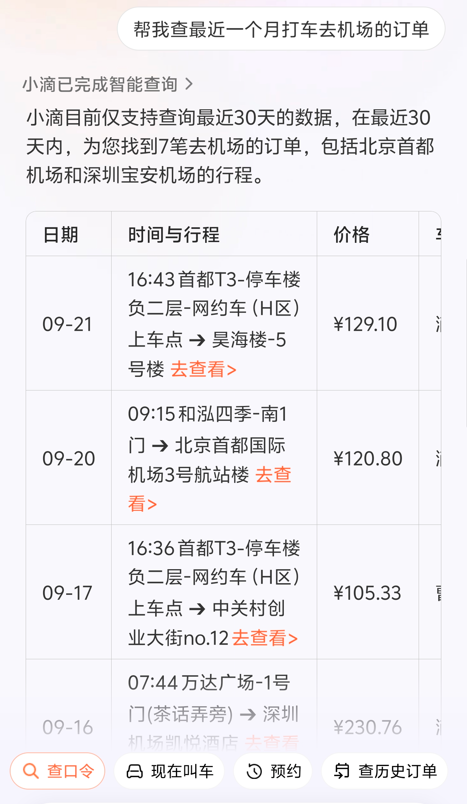 或者打车后,我指定地区、地点、时间段,就能让小滴帮我查相关订单或车费,对账报销更方便,差旅人狂喜啊!