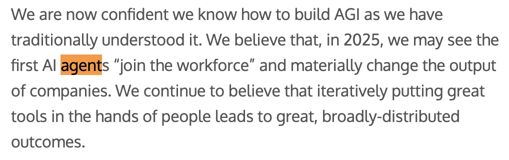 奥特曼发文称,OpenAI确信看到了通向传统意义上的AGI之路,今年Agent将首次进入职场。