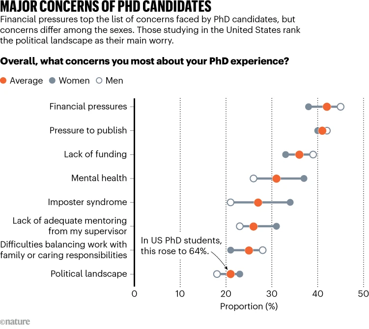 当被问及普遍担忧时,财务压力(42%)和发表论文的压力(41%)位列前两位。
