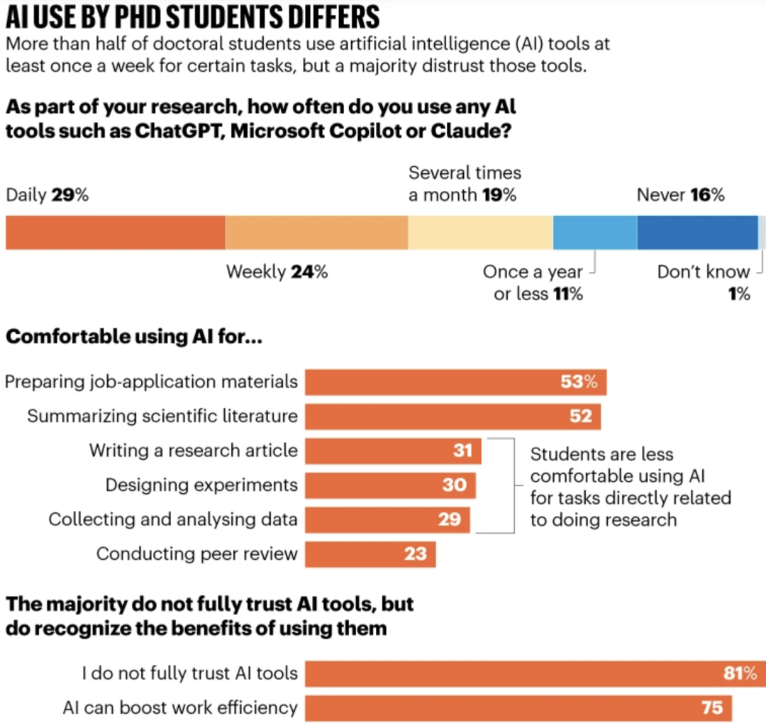 约53%每周在学习中使用,16%从未使用;75%认为能提效;71%接受在博士阶段使用