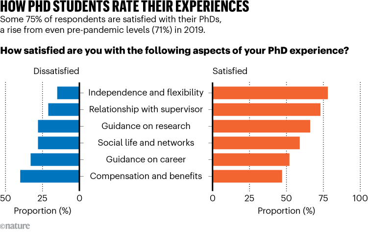 在调查中,大约78%的博士生对博士学习所带来的独立性和灵活性感到最满意。