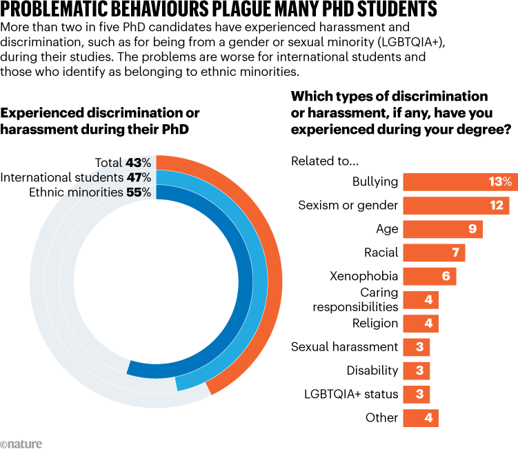 这一比例与2022年的调查(26%)类似。最常见的施害者是导师和其他资深学术人员,其次是同学。