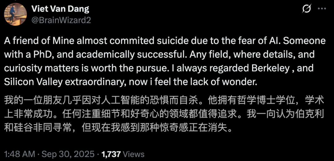 电气工程师、通信工程师Viet Van Dang感慨道:他的一个朋友几乎因为对AI的恐惧而自杀。