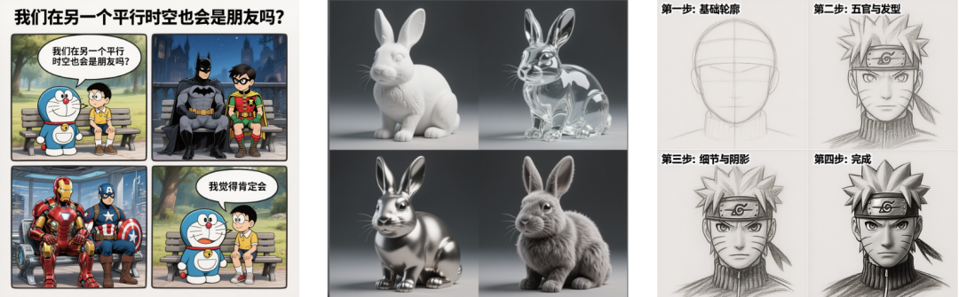 四宫格图生成也可以,创作漫画,设计不同材质的兔子模型,亦或是制作素描画漩涡鸣人的教程,通通不在话下。