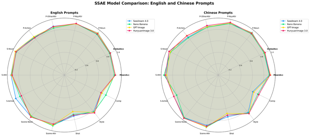 最终输出两个结果:平均图像准确率(图像层级的平均分数 MeanAcc)和全局准确率(所有要点的平均得分 GlobalAcc)。可以看到,HunyuanImage 3.0在最终结果和各细分要点上都媲美甚至超越业界领先的模型。