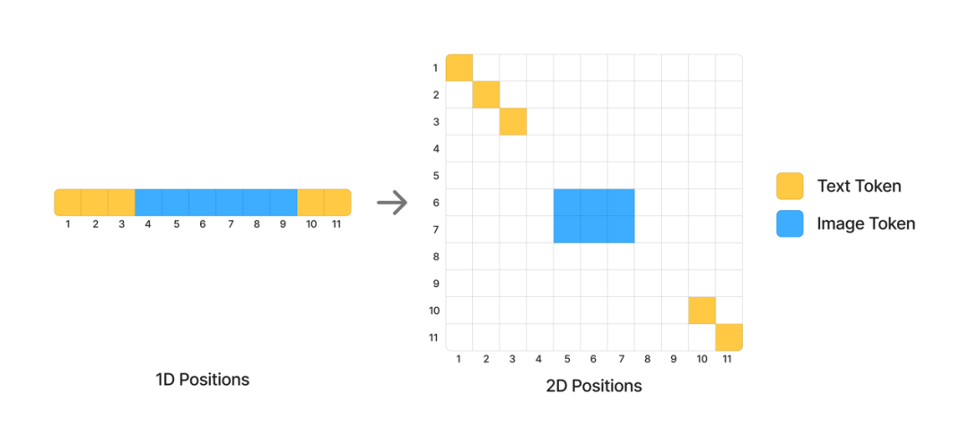 同时,为了保证扩展时完全兼容原来文本token的一维编码,文本的位置坐标从1,2,3,…扩展为(1,1),(2,2),(3,3),…,记不同维度上的频率为θ0,θ1,θ2,…,那么位置n的文本token的位置编码可以表示为[cos(nθ0),cos(nθ1),cos(nθ2),…,[sin(nθ0),sin(nθ1),sin(nθ2),…]。