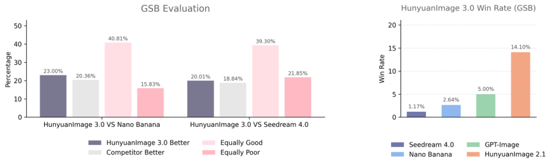 在人工评测GSB(Good/Same/Bad)中,HunyuanImag 3.0相较于Seedream 4.0胜率为1.17%,相较于Nano Banana胜率为2.64%,相较于GPT-Image胜率为5.00%,相较于目前最好的上一版本模型HunyuanImage 2.1胜率为14.10%,这表明HunyuanImage 3.0是足以媲美业界领先闭源模型的开源模型。