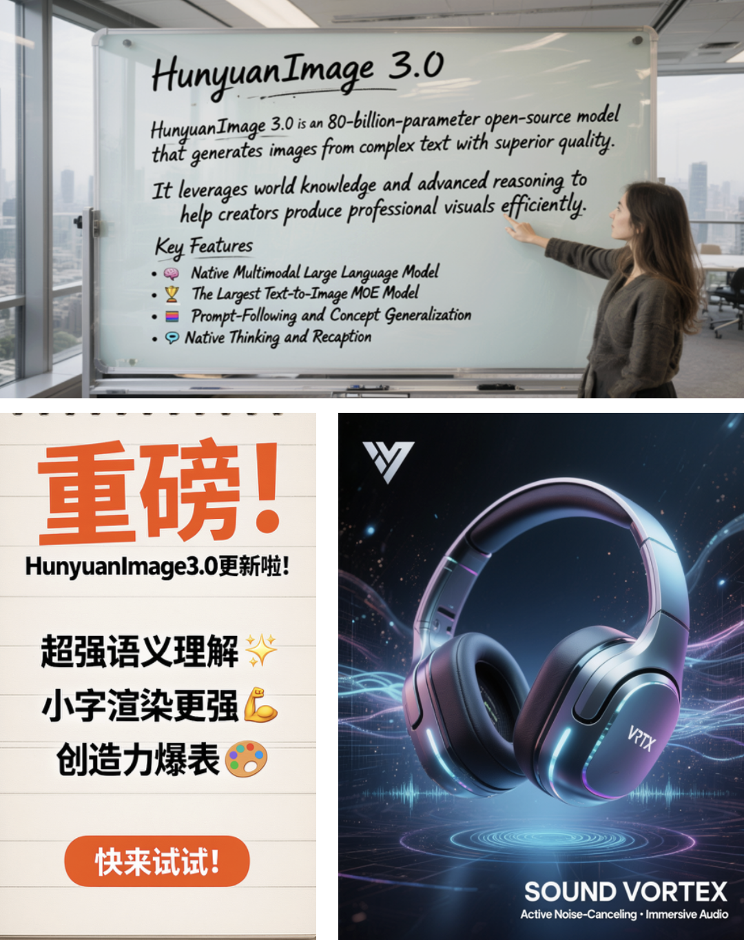 它还具有强大的文字渲染能力,通过对文字渲染数据的定向补充和借助HunyuanOCR进行文字识别的能力提升,3.0版本实现了接近头部模型的文字渲染能力,让海报、表情包制作、更多创意玩法变得更加简单。