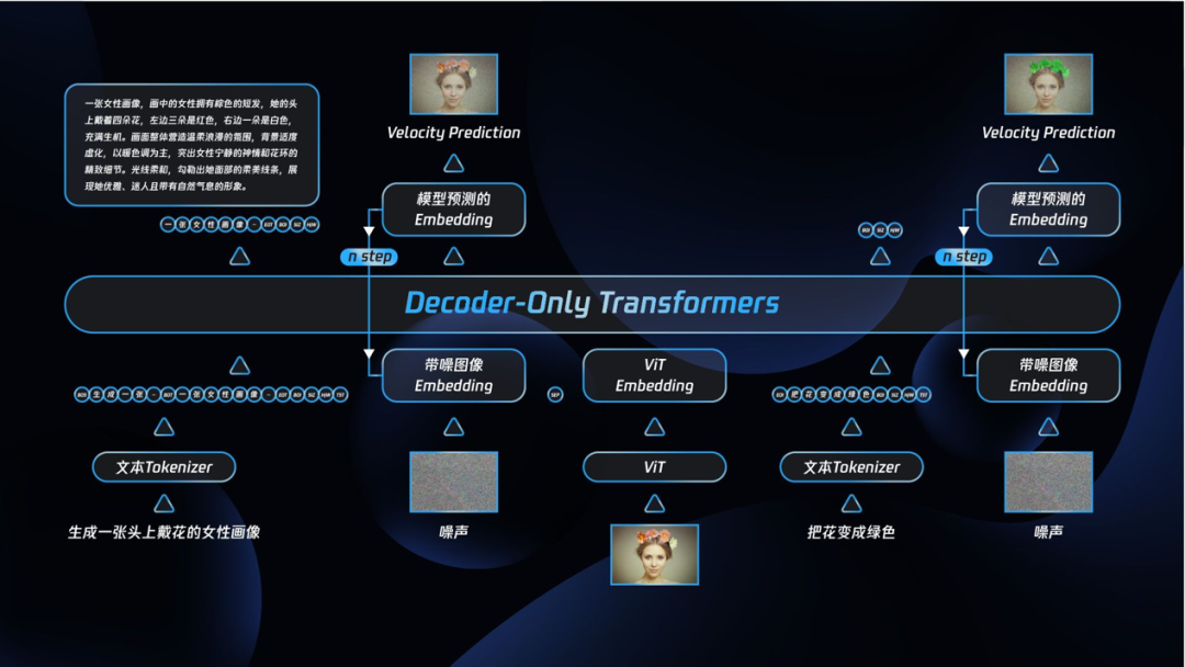 为提升长上下文理解与生成能力,模型采用“图文交织”的训练范式。训练序列中可包含多个用于扩散建模的加噪图像;而在推理阶段,一旦某张图像完成去噪即转化为“干净的条件图”,因此推理过程中最多仅存在一个加噪图。