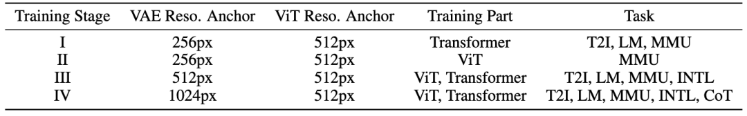 训练始于一个渐进式的四阶段预训练,该过程从较低的256像素图像分辨率和基础的图文对与纯文本数据开始,逐步将VAE处理的分辨率提升至512像素乃至1024像素,并在高分辨率阶段引入了如图像编辑、多图融合等更复杂的交错图文数据(INTL)以及用于激发推理能力的思维链数据(CoT)。