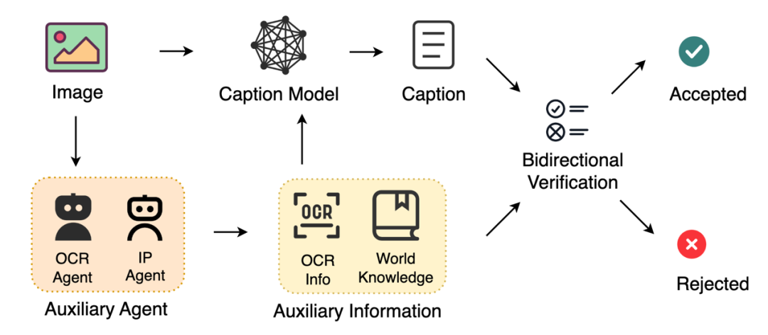 为保证描述的真实性,该系统集成了专门的OCR(文字识别)和命名实体识别代理来提供事实依据,并通过双向验证循环进行核对,此外还针对成对的图像数据开发了差异描述功能,用以生成描述变化的文本。