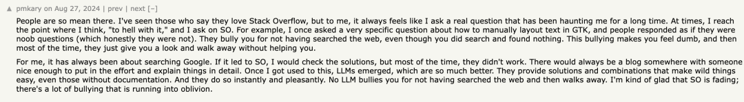 不少程序员直言,社区的氛围有时会令人不舒服,他们现在遇到问题更愿意咨询AI: