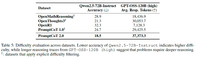 1、更难:在零微调评测下(例如直接使用强指令模型解题),PromptCoT 2.0表现为更低的即刻正确率和更高的推理token消耗,说明这些题目更能“咬合推理”,有效挖掘模型潜在的推理上限。
