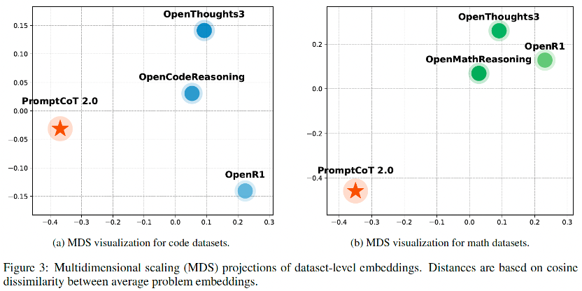 2、更具差异化:基于all-MiniLM-L6-v2的嵌入均值与余弦距离,并通过MDS映射到二维空间后,PromptCoT 2.0的数据点与现有开源题集(OpenMathReasoning、OpenThoughts3、OpenR1 等)形成了独立分簇,而后者之间分布更为接近。