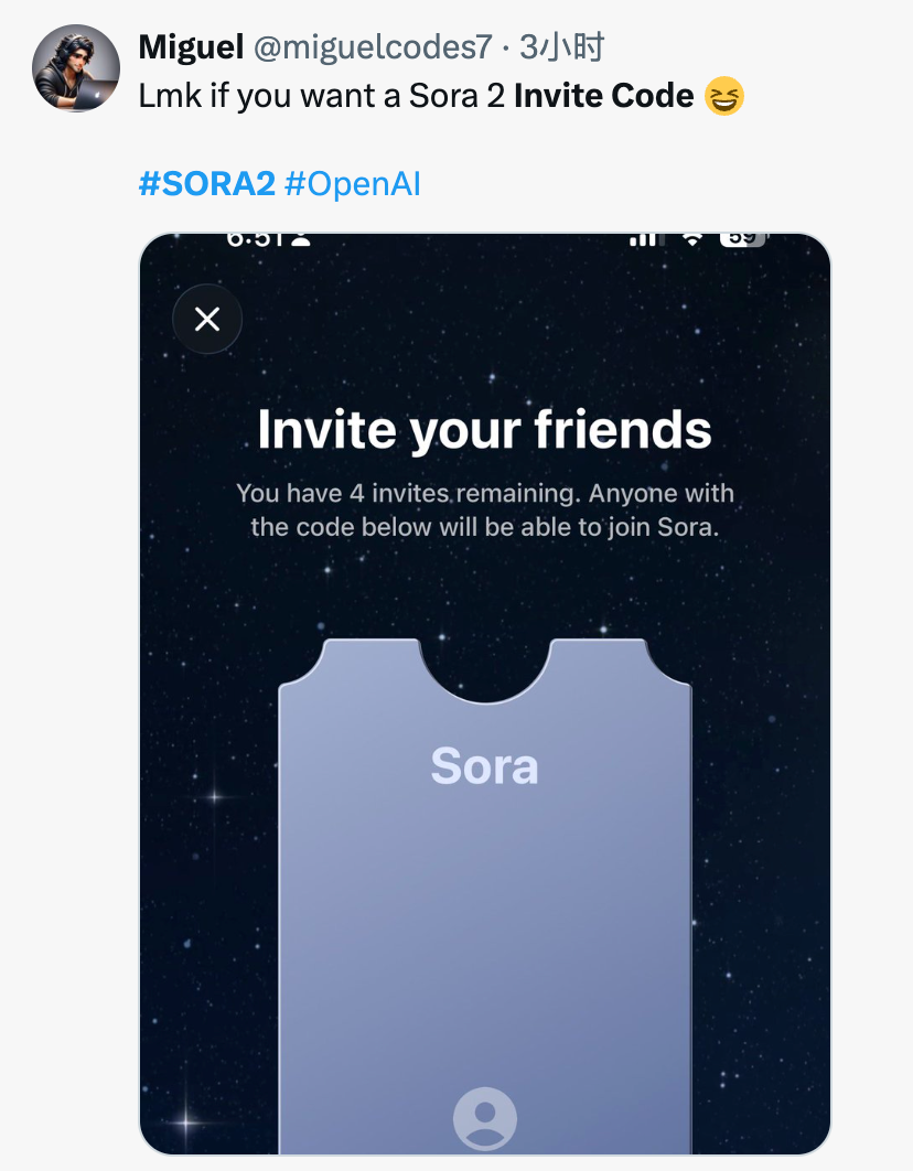 获取Sora 2邀请码目前主要靠朋友分享。
