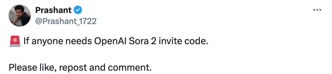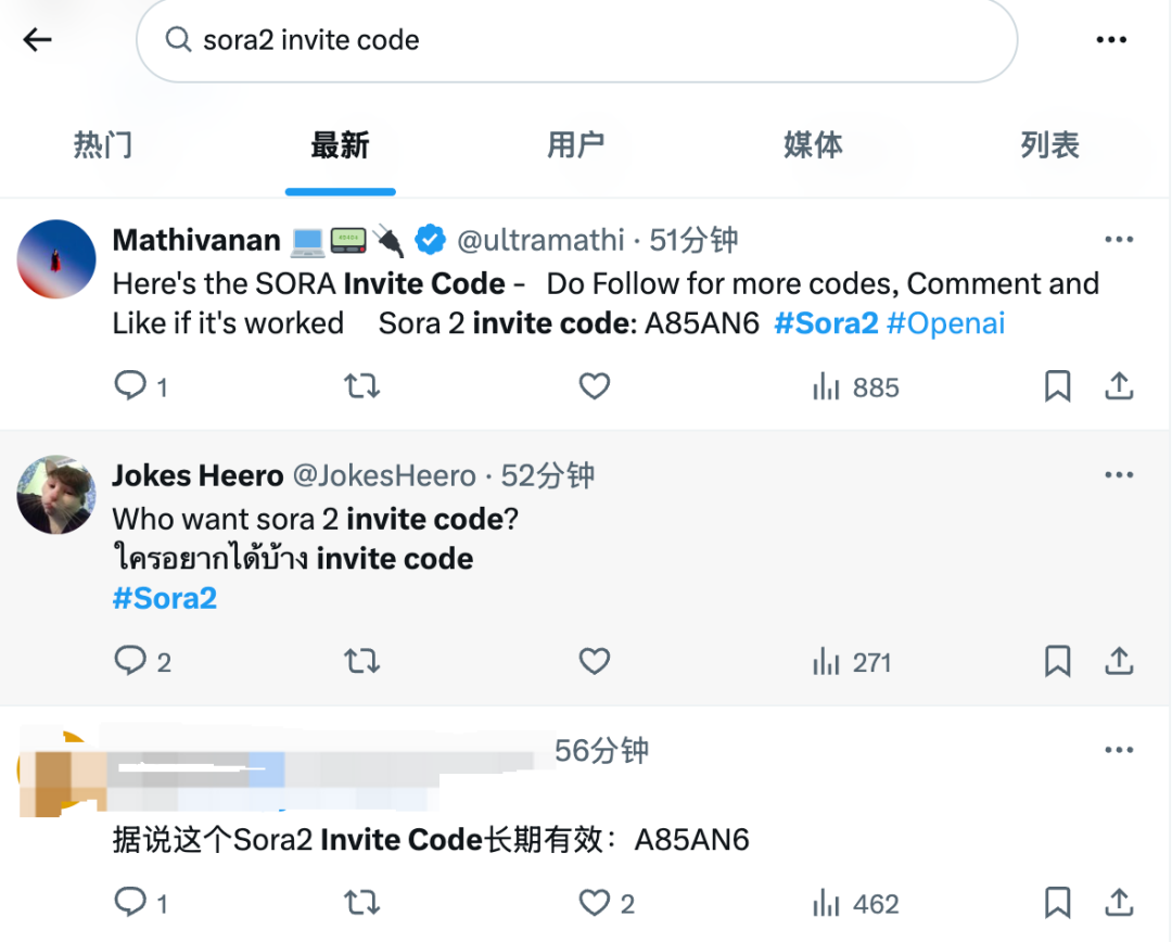 以「Sora 2 Invite Code」的关键词搜索,可以发现类似下面这种博主,你只要点赞、评论,就可以试着问他私信要一个验证码。