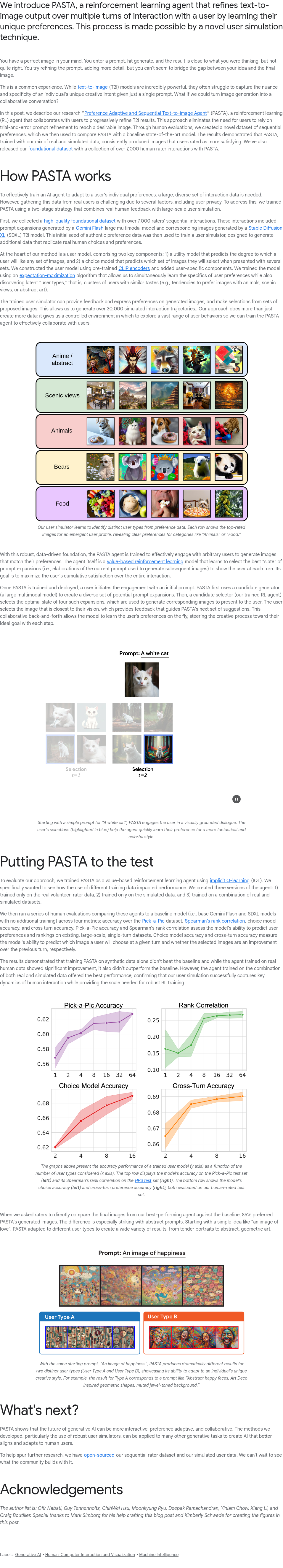 PASTA(Preference Adaptive and Sequential Text-to-image Agent)是一种基于强化学习的智能代理,旨在通过与用户多轮交互,逐步优化文本到图像的生成结果,以更精准地满足用户的个性化偏好。传统文生图模型常因单次提示无法充分表达复杂创意意图而受限。PASTA通过引入创新的用户模拟技术,实现对用户偏好的动态学习与响应,在每次生成后根据反馈调整输出,使图像逐步逼近用户理想效果。该方法将静态生成过程转化为动态协作对话,显著提升生成图像的准确性和用户满意度,推动文生图系统向更具交互性与个性化的方向发展。