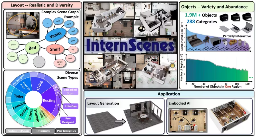InternScenes 是由上海人工智能实验室联合上海交通大学、北京航空航天大学等机构发布的一个具有逼真布局的大规模可模拟室内场景数据集,相比以往数据集,该数据集特别保留了大量小型物体,从而构建出更加逼真且复杂的场景布局,每个区域平均包含 41.5 个对象。