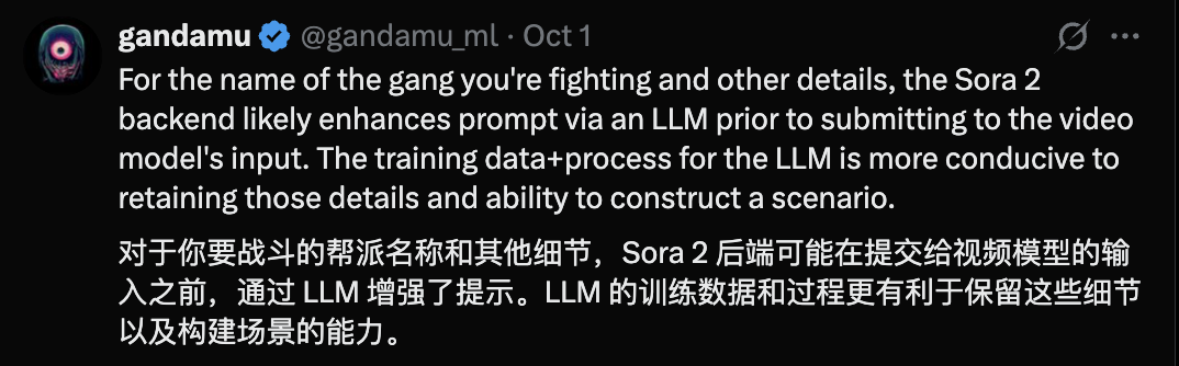 关于这些高能表现,有不少人认为Sora2可能是基于LLM训练的。