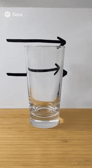 在桌子上放一张立着的纸,纸上画有两个箭头,一个在另一个下方,两个箭头指向同一个方向。然后在箭头前面放一个大的玻璃杯,使得从玻璃杯中可以看到箭头。接着将玻璃杯装满。