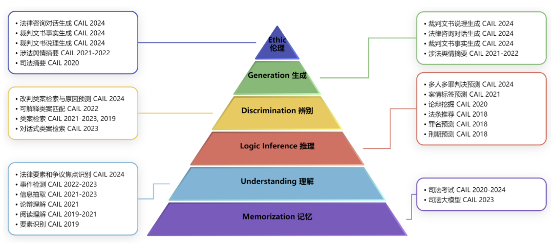 近年来,随着以裁判文书为代表的司法大数据不断公开,以及自然语言处理技术的不断突破,如何将人工智能技术应用在司法领域,辅助司法工作者提升案件处理的效率和公正性,逐渐成为法律智能研究的热点。中国法律智能技术评测CAIL(Challenge of AI in Law)旨在为研究者提供交叉学科的学术交流平台,推动自然语言处理、智能信息检索等人工智能技术在法律领域的应用,共同促进中国法律智能技术的创新发展,为科技赋能社会治理作出贡献。 为了促进智能技术赋能司法,实现更高水平的数字正义,在最高人民法院和中国中文信息学会的指导下,从2018年起,CAIL已连续举办了六届中国法律智能技术评测,先后吸引了来自海内外高校、企业和组织的近5000支队伍参赛,成为中国法律智能技术评测的重要平台。CAIL 2018设置了罪名预测、法条推荐、刑期预测三个任务,并提供了包含268万刑事法律文书的数据集;CAIL 2019设置了阅读理解、要素识别、相似案例匹配三个任务;CAIL 2020设置了阅读理解、司法摘要、司法考试、论辩挖掘四个任务;CAIL 2021设置了阅读理解、类案检索、司法考试、司法摘要、论辩理解、案情标签预测、信息抽取七个任务;CAIL 2022设置了司法考试、事件检测、文书校对、类案检索、涉法舆情摘要、论辩理解、信息抽取、可解释类案匹配八个任务;CAIL 2023设置了司法考试、对话式类案检索、类案检索、事实认定、论辩理解、信息抽取、司法大模型七个任务;CAIL 2024设置了裁判文书事实生成、裁判文书说理生成、法律要素和争议焦点识别、二审改判类案检索与原因预测、法律咨询对话生成、司法客观题考试、多人多罪判决预测、司法主观题考试八个任务。随着智能技术与法律需求交叉融合的不断深入,CAIL的任务设置更加符合司法需求,任务难度也逐年升级。 大型语言模型在自然语言处理任务中取得了显著进展,并在法律领域展现了相当大的潜力。然而,法律应用在准确性、可靠性和公平性方面都有非常高的要求。在未仔细评估其潜力和局限性的情况下,将现有的大模型应用于法律系统,可能会对法律实践带来重大风险。为此,我们构建了法律认知能力评估框架,将司法大模型应当具备的能力分为六个层次,包括:记忆层、理解层、推理层、辨别层、生成层、伦理层。记忆能力评测,是评估模型记忆法律信息的能力,包括法律概念,法律规则,法律演变等;理解能力评测,是评估模型理解法律含义及其影响的能力,包括法律要素识别,法律事实验证,阅读理解,关系抽取,命名实体识别;逻辑推理能力评测,是评估模型运用法律事实进行逻辑推理的能力,包括案由预测,法条预测,刑期预测,多跳推理,法律计算,争辩挖掘等;辨别能力评测,是评估模型分析和判断法律信息的价值的能力,包括类案辨别,文档修正等;生成能力评测,是评估模型撰写专业的法律文件和论证性文本的能力,包括摘要生成,裁判分析过程生成,法律翻译,开放式问答等;伦理评测,是评估模型判断法律中的伦理问题的能力,包括偏见与歧视,道德,隐私。有关法律认知评估框架和司法大模型评估的更多内容,请参见论文LexEval(https://arxiv.org/abs/2409.20288)。
