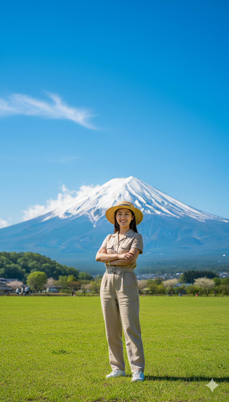 Prompt:一张人像照片,内容为一名中国女生在富士山下摆姿势拍摄。人物占据画面主要比例,背景是巍峨的富士山与蓝天白雪,充满整个画面。场景突出了人物与山峰之间的对比,营造出清晰震撼的氛围,带有旅行大片的质感。在自然白天阳光下拍摄,使用Sony Alpha 7R IV相机搭配85mm f/1.4镜头。色彩风格为高饱和度、明亮清晰的社交媒体风格。画面比例为9:16。