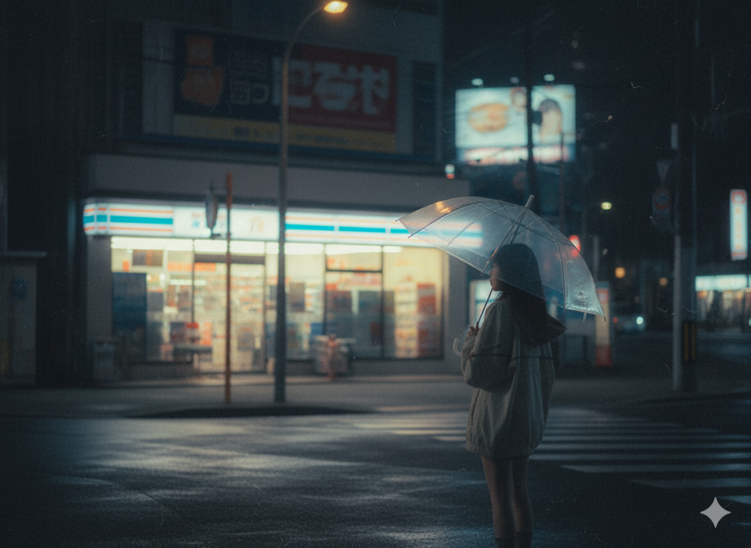 Prompt:一张关于梦核风格的照片 内容为一位少女独自站在空旷的街角 背景是泛着昏黄灯光的便利店与模糊的广告牌 场景呈现出似真似幻的都市夜晚 氛围怀旧迷离带有孤独感与不真实的怀旧气息 在深夜路灯与霓虹交织的光线下拍摄 使用 Nikon Z7 II 相机 50mm f/1.4 镜头 色彩风格为低饱和度带有颗粒质感的梦核风格 画面比例为4:3。
