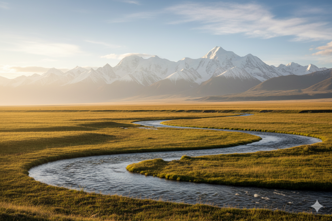 Prompt:一张以3:2画幅比例拍摄的风光照片。画面展现辽阔的高原草地,远处雪山与天空相接,前景蜿蜒的河流引导视线延伸至地平线。沐浴在清晨金色的阳光下,氛围柔和、清澈而明亮。构图开阔且灵活,既可横幅展现山川的壮丽,也可竖幅裁切突出天空与地平线的延伸感。使用徕卡M11相机搭配35mm f/1.4镜头拍摄。色彩调校强调高分辨率、细节丰富,并呈现自然的摄影风格。