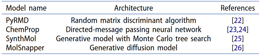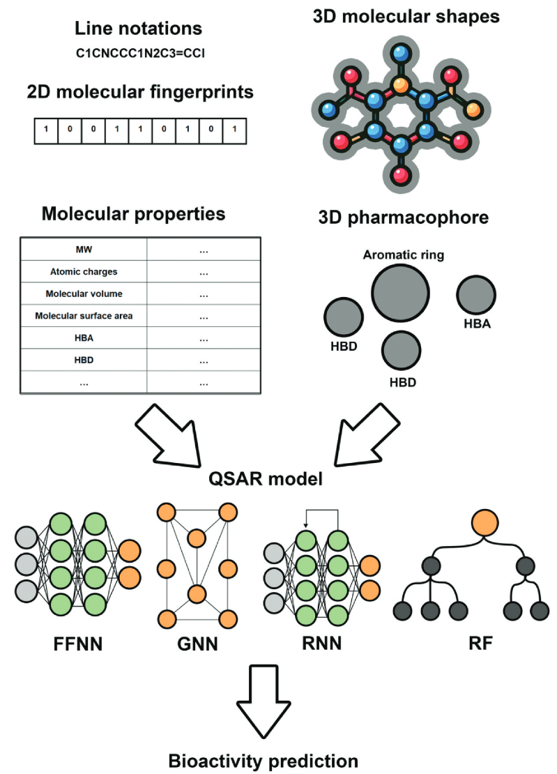 近年来,基于AI的QSAR模型已在许多LBVS实践中成功应用。通过学习2D或3D分子描述符的分子信息来提升预测性能(图1)。常用的LBVS方法在表1中进行了总结。其中一个方法是PyRMD,它使用随机矩阵判别算法,可在有限计算资源下,仅需数小时就能从超大型化合物库中分类活性和非活性分子。QSAR与AI的互补性体现在多种模型的整合中,例如随机森林(RF)、朴素贝叶斯(NB)和支持向量机(SVM)。Gomes等人提出了一种共识QSAR模型,整合了多种机器学习算法,用于发现抗结核化合物,并证明其对耐药菌株表现出较强活性。