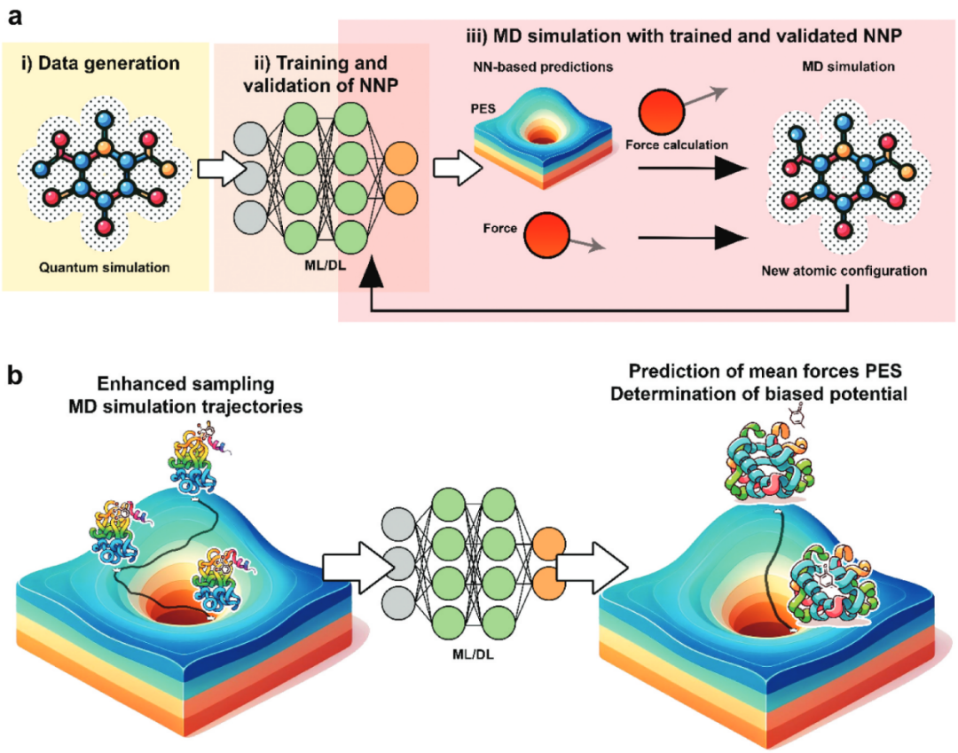 将AI方法应用于MD模拟仍处于早期阶段,目前主动学习(AL)扮演着最重要的角色。AI有望显著提升MD的计算效率,并改进蛋白-配体结合能的计算(图3)。潜在应用包括基于深度学习的增强采样MD模拟、基于深度学习的模拟分析、以及基于机器学习/深度学习的力场开发(如网络势能模型)。