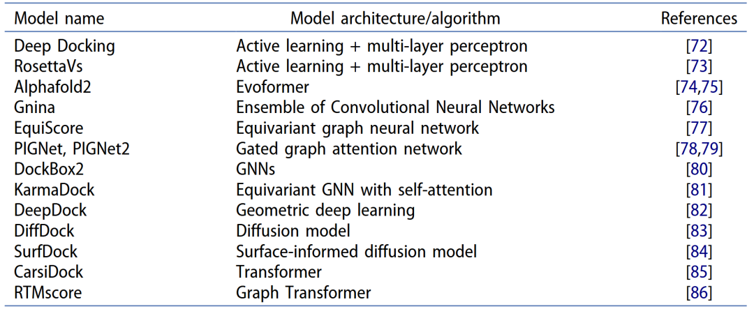 在SBVS中,分子对接是应用最广泛的方法,其目标是预测潜在的蛋白-配体相互作用,并通过打分函数(SFs)对所得结合构象进行排序,以估算结合亲和力。然而,分子对接仍面临重要局限。其一,打分函数与优化/搜索算法之间的平衡是关键挑战。高效的对接不仅需要准确、快速的打分函数计算,还需要稳健的搜索与优化策略,以探索小分子结合于靶点时的构象空间。另一大局限在于通常忽略了蛋白质的柔性,而这对模拟真实的分子相互作用至关重要。为克服这些挑战,近年来提出了多种AI方法以改进分子对接(图2及表2)。