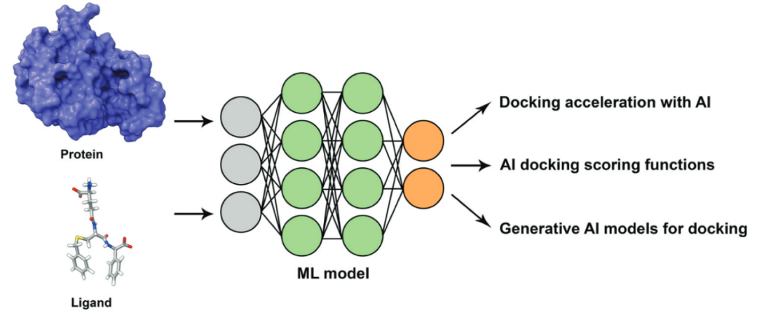 AI在分子对接中的应用主要包括三类方法。其一,使用ML模型加速分子对接,通过训练对接得分的代理模型快速筛选大型化合物库。代表性方法包括Deep Docking、RosettaVs等。另一个活跃的研究方向是开发基于AI的打分函数,以更准确地预测对接中的结合亲和力。代表性方法包括Gnina、EquiScore、PIGNet以及DockBox2。最后一类方法为提出基于生成模型的策略,作为物理采样的替代,用于探索并能量评估广泛的蛋白-配体构象空间,从而更准确地产生合理的结合构象。代表性方法包括DiffDock、SurfDock、KarmaDock等。