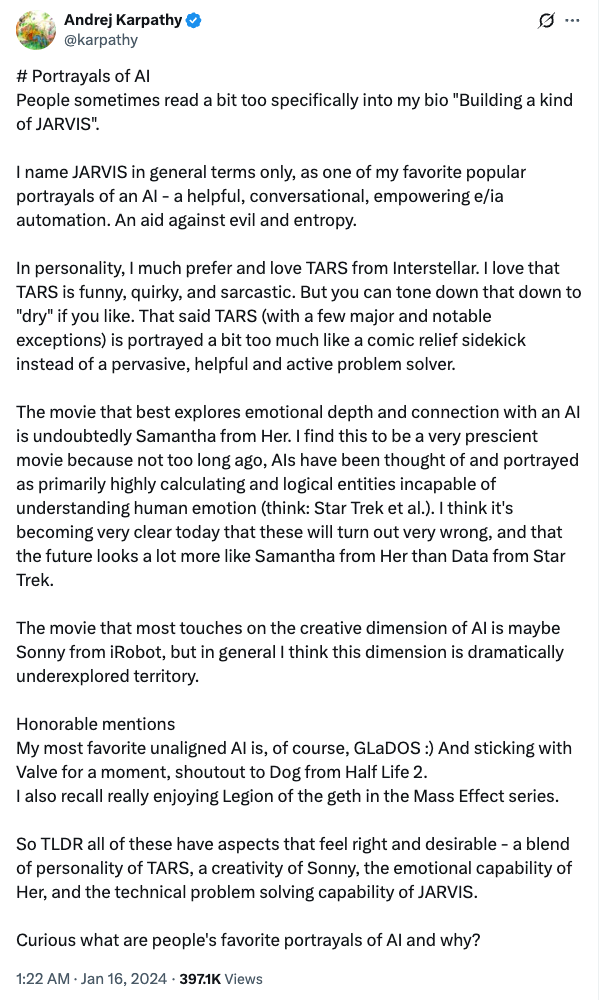 OpenAI 的创始成员 Andrej Karpathy 回归 OpenAI 后,也曾在 X 上表示自己要创立一个「贾维斯」,「作为我最喜欢的人工智能刻画之一——一个乐于助人、善于对话、赋能的电子/信息自动化系统」。