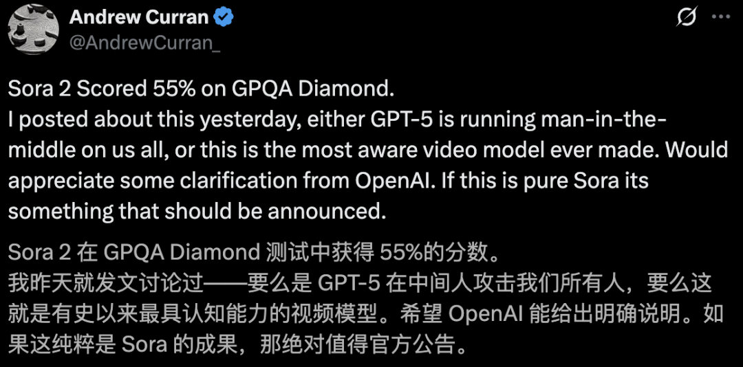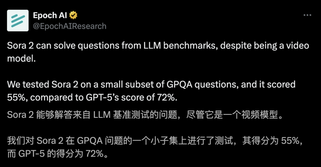 在GPQA问题的一个小子集上,Epoch AI测试了Sora 2,其得分为 55%,而GPT-5的得分为 72%。
